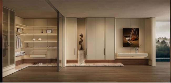 在卧室这一 “休憩核心区”,皮阿诺「峪」系列采用墙柜一体设计,圆弧墙板取意山川的自然弧度,打破传统方正空间的生硬感,搭配铝合金饰条的轻奢点缀,营造出柔和静谧的安眠氛围。特色内嵌式拉手融入门板,线条简洁流畅,睡前整理衣物时无需担心磕碰,指尖触碰的顺滑感进一步舒缓身心。