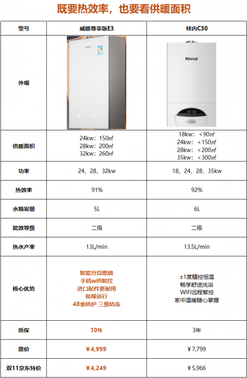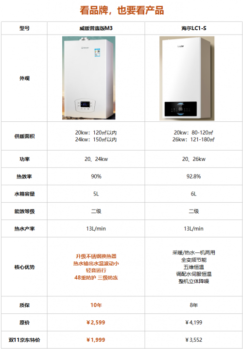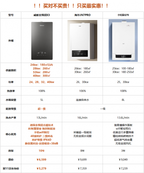 在性价比爆款对比中,威暖普惠版M3与海尔LC1 - S均为入门优选。M3在核心部件上毫不含糊,换热器材质和水泵品牌都十分扎实,在提供稳定基础功能的同时,价格更具杀伤力,真正做到“入门即高配”。再看均衡标杆对比,威暖尊享版E3与林内C30相比,在运行噪音、热水稳定性、智能控制等方面表现出色,静音和恒温舒适性上不输甚至超越以品质著称的林内。而且,威暖提供“十年整机质保”和“48小时闪电售后”的服务优势,让用户无后顾之忧。就像图中海尔JN7系列虽也有其特点,如不同型号的加热功率、适用面积和恒温配置等,但威暖在综合对比中更胜一筹。