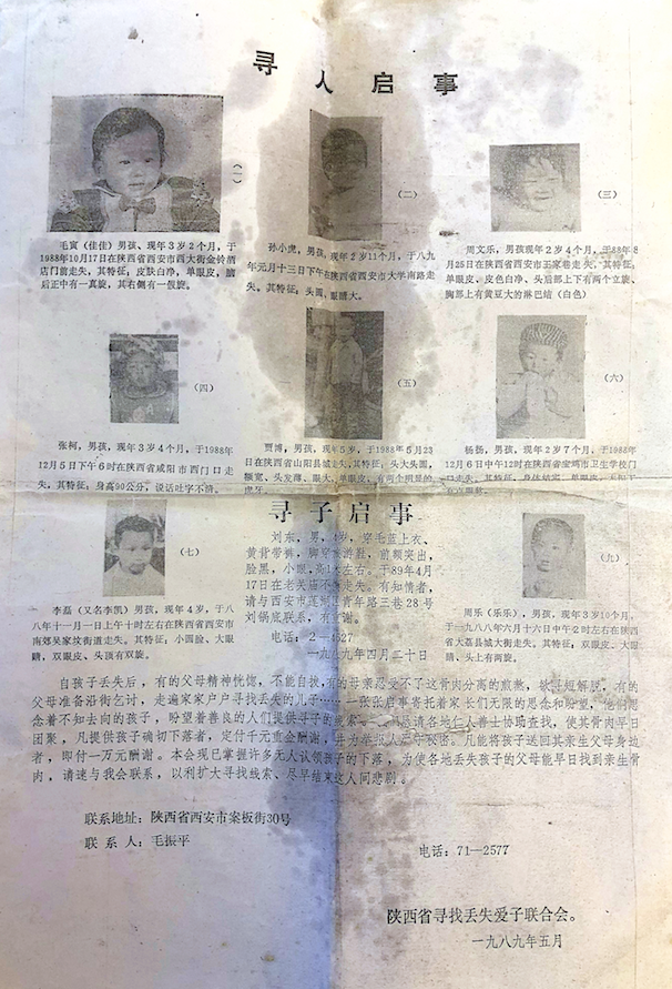 孩子没了,李静芝和丈夫疯了似的,拿着寻人启事挨家挨户地找,附近的电线杆上都是毛寅的照片。找完了西安的大街小巷,他们又跑到外市外县,沿路把整个陕西省都走了一遍。也去过山东、浙江、广州,跑过河南、河北、福建。