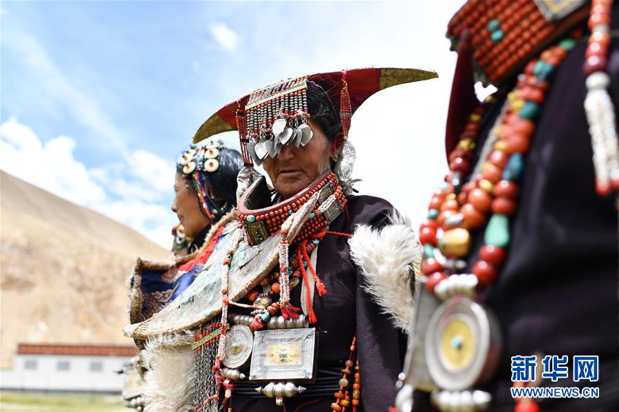 在西藏阿里地区普兰县科迦村,村民在展示普兰服饰(7月28日摄)。 在西藏阿里地区普兰县,至今保留着独特的藏族服饰——普兰服饰。据了解,普兰服饰已有1000多年的历史,其中最精美、最独特的是妇女的“孔雀”服饰,一套重达20多公斤,装饰有黄金、白银、蜜蜡、珊瑚、绿松石等,堪称“穿在身上的千年历史”。 新华社记者 詹彦 摄