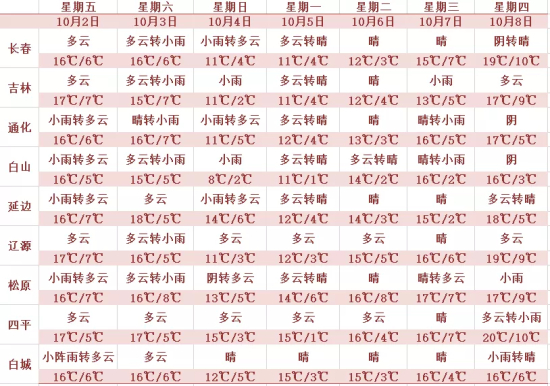 3日夜间到4日白天,全省多云有时阴,吉林、延边、长白山保护区有小到中雨,其他地区有小雨。