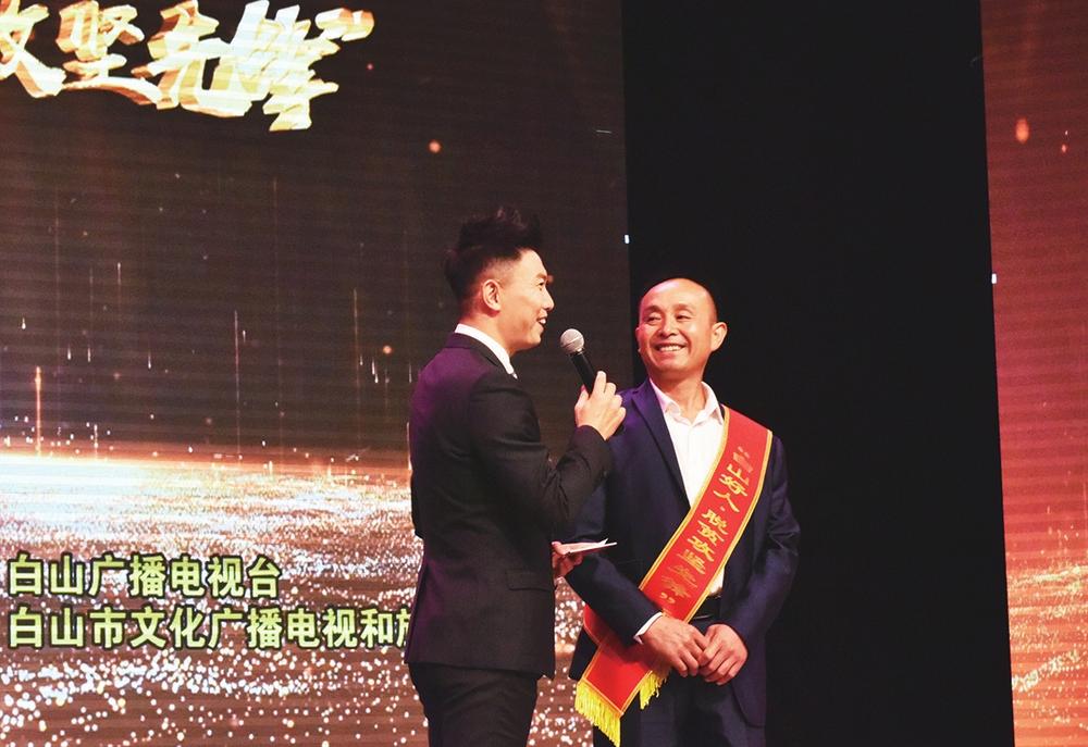 “白山好人·脱贫攻坚先锋”标兵高秀虎接受现场采访。