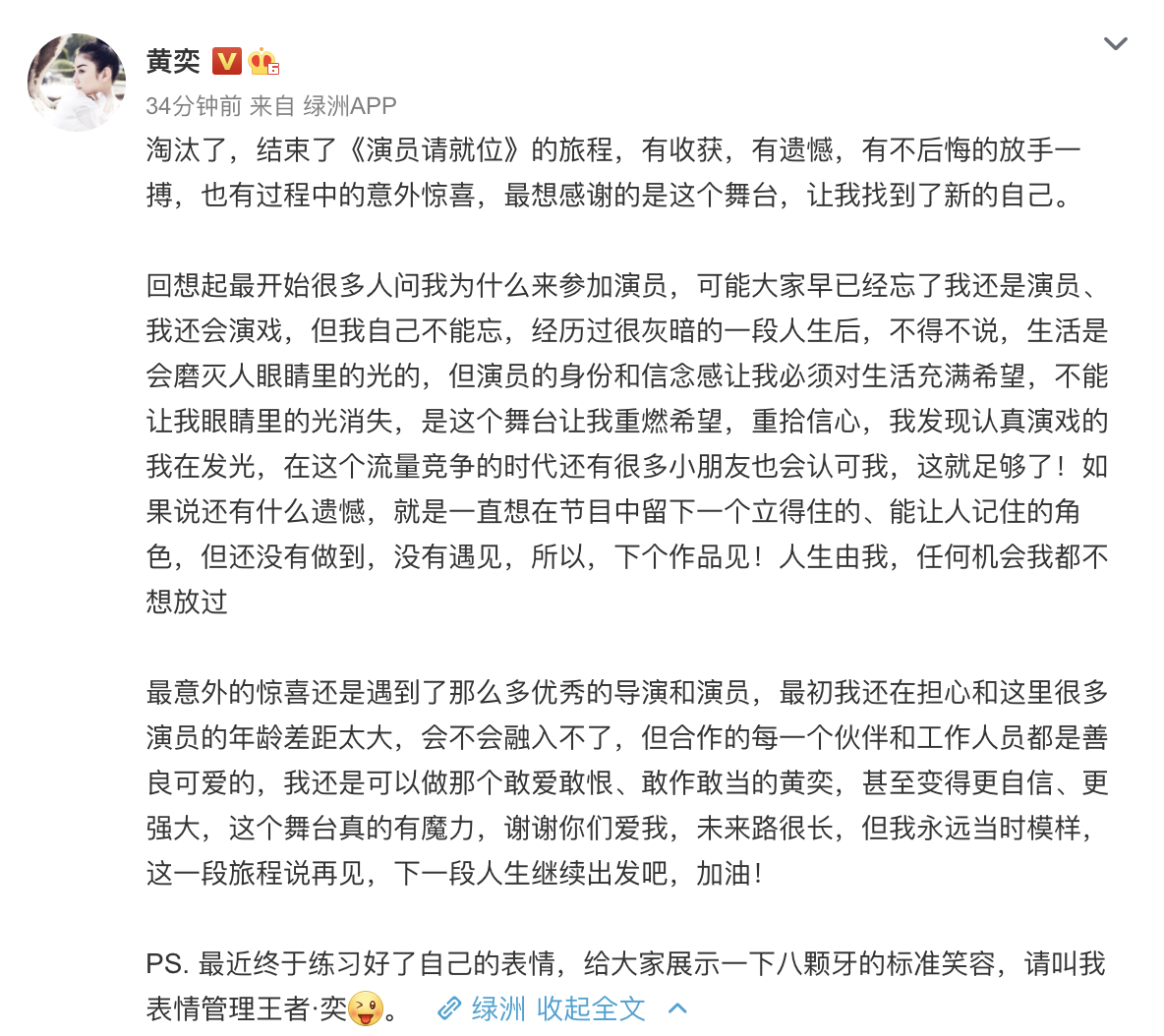 黄奕在文中表示,是这个舞台让自己重燃希望、重拾信心,“我发现认真演戏的我在发光,在这个流量竞争的时代还有很多小朋友也会认可我,这就足够了!如果说还有什么遗憾,就是一直想在节目中留下一个立得住的、能让人记住的角色,但还没有做到,没有遇见,所以,下个作品见!”
