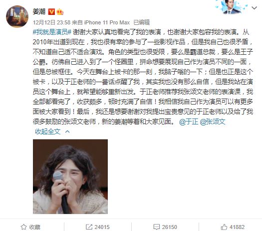 随后姜潮微博发文回应,称自己也很矛盾,不知道自己适不适合演戏。“于正老师的一番话点醒了我,其实我也没有那么自信,但是我站在演员这个舞台上,就希望能够重新出发。”