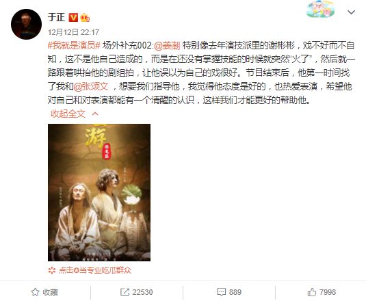 稍晚,于正微博发文表示姜潮特别像去年演技派里的谢彬彬,戏不好而不自知,“这不是他自己造成的,而是在还没有掌握技能的时候就突然“火了”,然后就一路跟着哄抬他的剧组拍,让他误以为自己的戏很好。”并表示希望他对自己和对表演都能有清醒的认识,这样才能帮助他。