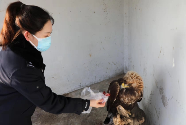 12月11日,向海森林公安分局接到洮南市森林公安大队电话称,在洮南市蛟流河乡境内发现一只“大鸟”疑似受伤。民警立即与向海保护局野生鸟类救助中心工作人员取得联系并一同前往救助。到达现场后,经野生鸟类救助中心工作人员初步鉴定,这只“大鸟”为世界濒危物种、国家一级保护鸟类金雕,该金雕翼展约1.5米,属亚成体。随后,民警与工作人员将其安全带至向海野生鸟类救护中心进行详细检查并积极治疗。在与工作人员进一步沟通后得知,该金雕长期未进食身体比较虚弱,还不具备放归野外的条件,需要进一步的观察喂养,民警随即买来新鲜肉块进行喂食,相信在民警和工作人员的共同照料下,这只金雕将很快回归自然。