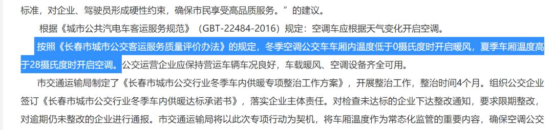 长春市发展和改革委员会官方网站上,发布了《关于召开长春市空调公共汽电车票价调整听证会的公告》,其中明确服务标准方面写明,按照《长春市城市公交客运服务质量评价办法》的规定,冬季空调公交车车厢内温度低于0℃时开启暖风。