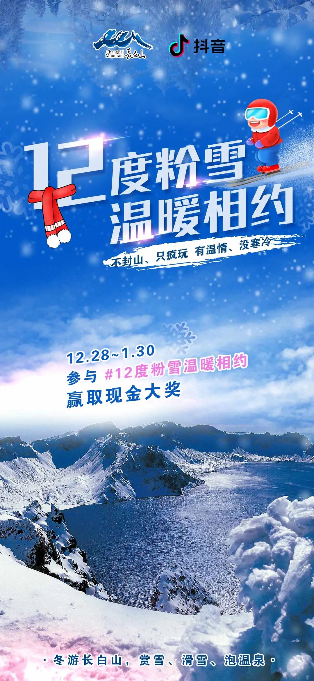 即日起至1月30日,拍摄与长白山美景、文化相关的正能量视频,添加话题#12度粉雪温暖相约,即有机会赢取现金大奖。