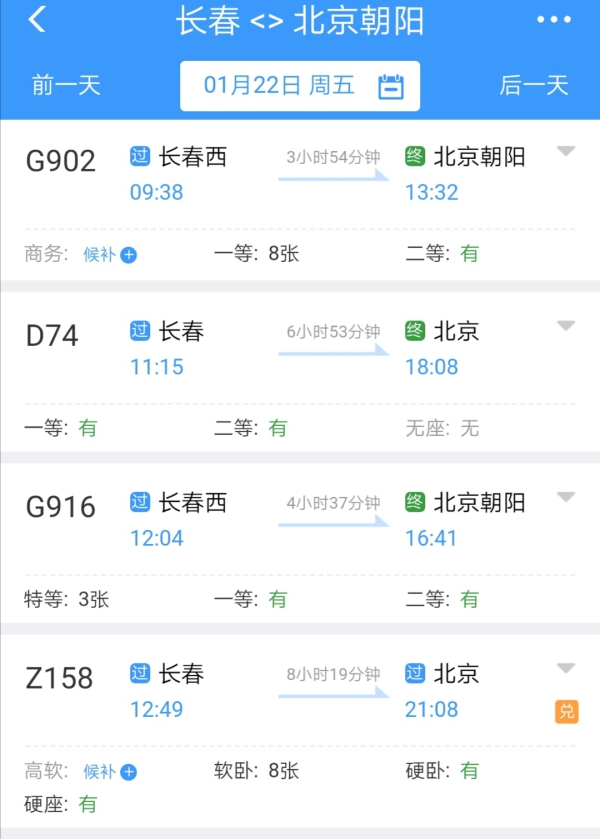 1月21日10时后,中国吉林网通过12306客户端查询到1月22日长春至北京朝阳、长春西至北京朝阳的高铁列车。