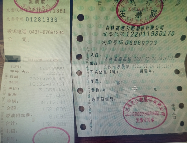 行驶票据及支付信息:出租车发票显示里程47.4公里,等候12分44秒,收费158元;高速公路发票显示当日16:47:55由吉林龙嘉机场口进入高速,17:11:45由长春南收费站口驶出高速,收费17元。当日17时31分,手机支付宝支付175元车费,与票据价值相符。