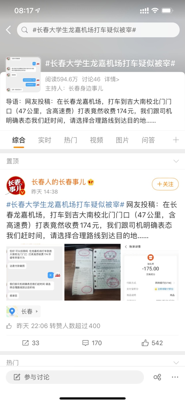 2021年3月3日,网络出现一篇题为“长春大学生龙嘉机场打车疑似被宰的爆料”:大学生在长春龙嘉机场,打车到吉大南校北门门口(47公里,含高速费),打表竟然收费174元,学生跟司机明确表态赶时间,请选择合理路线到达目的地,有发票有车号。长春市交通运输综合行政执法支队对此案件高度重视,立即责成执法六大队展开调查,现将调查情况公布如下。