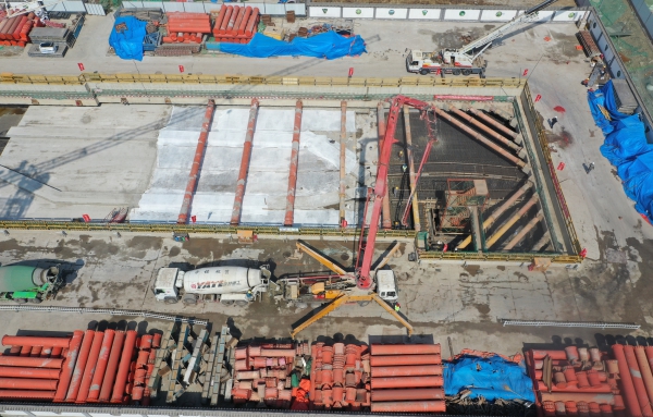 据了解,该车站2020年7月5日进入主体施工阶段,经历8个月的施工,于4月18日完成主体结构封顶工作,提前28天完成了该施工节点。接下来东枢纽站将进入附属风亭施工,目前正在进行2号风亭的场地布置。