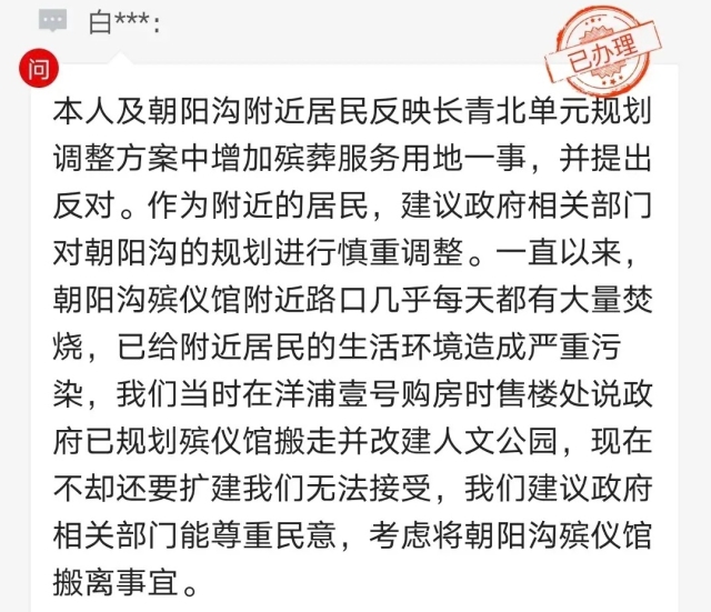 该市民在吉林省长春市市长公开电话办公室留言道:“本人及朝阳沟附近居民反对长青北单元规划调整方案中增加殡葬服务用地一事。作为附近的居民,建议政府相关部门对朝阳沟的规划进行慎重调整。”