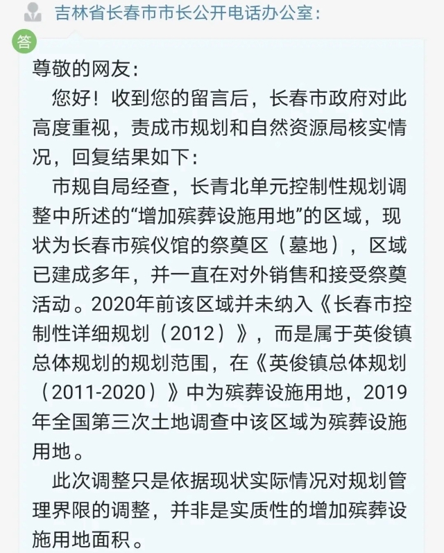 4月20日,吉林省长春市市长公开电话办公室给出了回复:“长青北单元控制性规划调整中所述的‘增加殡葬设施用地’的区域,现状为长春市殡仪馆的祭奠区,区域已建成多年,并一直在对外销售和接受祭奠活动。2020年前该区域并未纳入《长春市控制性详细规划(2012)》,而是属于英俊镇总体规划的规划范围,在《英俊镇总体规划(2011-2020)》中为殡葬设施用地,2019年全国第三次土地调查中该区域为殡葬设施用地。此次调整只是依据现状实际情况对规划管理界限的调整,并非是实质性的增加殡葬设施用地面积。”