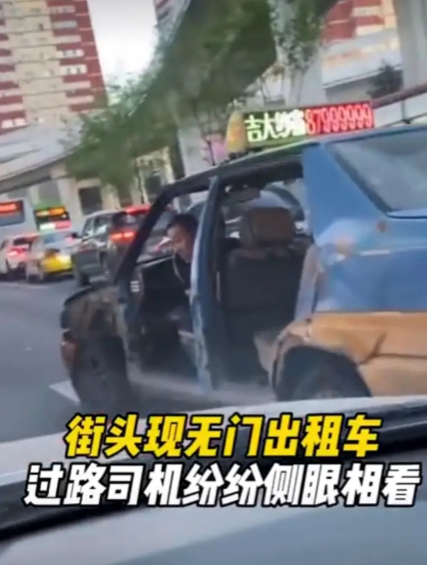 据一名司机介绍,他正开车时,突然发现前方一辆出租车有些不同寻常,并试图并线。他将车开近一看,着实吓了一跳。这辆车司机一侧的前后两个门都不见了,而司机却淡定地开着车。