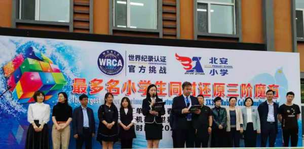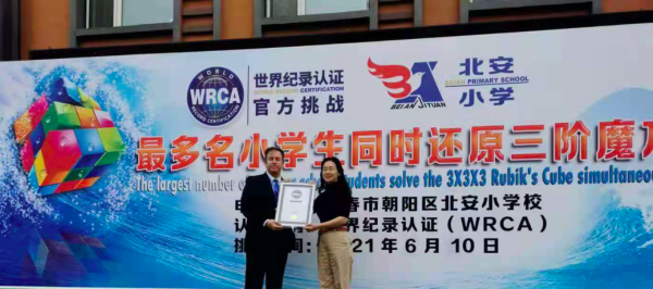 在朝阳区北安小学操场上,1180名学生开始旋转魔方,小小的魔方在孩子们手中快速地翻转、变换。魔方旋转的响声在操场上此起彼伏,两分钟后,监督员入队检查六面复原情况,核实人数并填写表格,最后认证官认证核实。经过严格的核实,认证结果——“最多名小学生同时复原三阶魔方”挑战成功!世界纪录认证机构认证官向北安小学颁发了世界纪录证书。