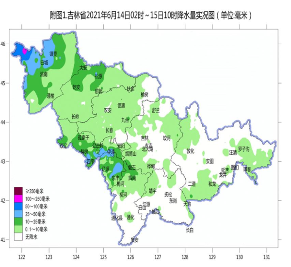 15日,中国吉林网从吉林省气象局获悉,受高空槽影响,6月14日凌晨开始,吉林省大部分地区出现雷雨天气,白城地区雨量较大,部分乡镇出现大到暴雨。截至15日10时,全省平均降雨量5.1毫米,地区分布:白城25.4毫米,辽源19.5毫米,四平13毫米,松原7.1毫米,其他地区不足5毫米。