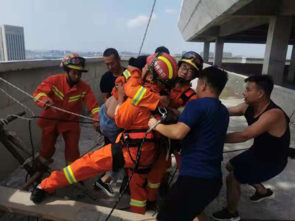消防救援人员使用全身吊带 ,滑轮组和安全绳做好防护,该女性由于长时间体力透支严重,已无法站立行动。救援人员决定利用21层建筑高差设置起吊绳配合拖拽实施救援。