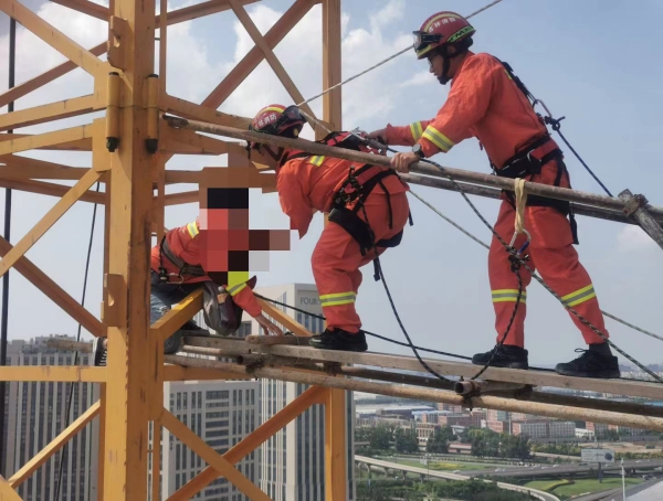 由于被困群众位于塔吊主体内,侧向跨坐在木板边缘,救援人员试图穿过被困人员寻找支点,困难极大。且被困人员身体侧方又斜向塔吊支撑梁,不便于直接拖拽。救援作业面较小,仅为40cm宽木板。该建筑高为80米,对消防救援人员心理素质是极大考验。经过了解,轻生人员为女性,50岁,25小时时间内始终保持同一坐姿未移动,未进食,且经询问,患有较重心脏病,在救援人员监护过程中,平均每半小时吞服一片速效救心丸。在救援过程中,处于近虚脱状态,手脚不能正常发力。
