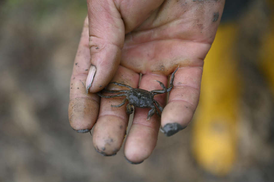 向前往去,一块标有“稻蟹共生”文字的大牌子格外醒目。稻田里,一只只还没有手掌大的小螃蟹正在努力找寻着最舒适的“栖息地”,发出阵阵“窸窣声”,一阵暖风吹过,水稻叶也跟着微微颤动,伴随着“窸窣声”形成了一种和谐的生态农业画卷。