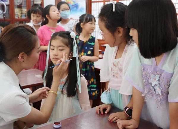 现场,老师们和志愿者们还为同学们点花钿、涂口脂,同学们不但有了美的享受,还学到古代关于化妆品的知识。