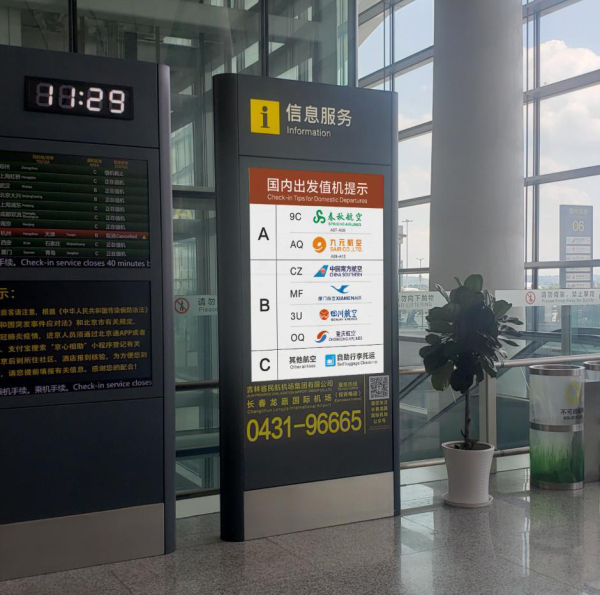 与此同时,在B、C值机岛靠近入口一侧,设置电子显示屏播放国内出发值机提示信息,让出行旅客能够便捷地找到目标航空公司所在。接下来,长春机场将进一步对各值机岛标识进行改造,增加各航空公司值机分布区域标识,有效解决旅客找不到航空公司值机柜台的问题。