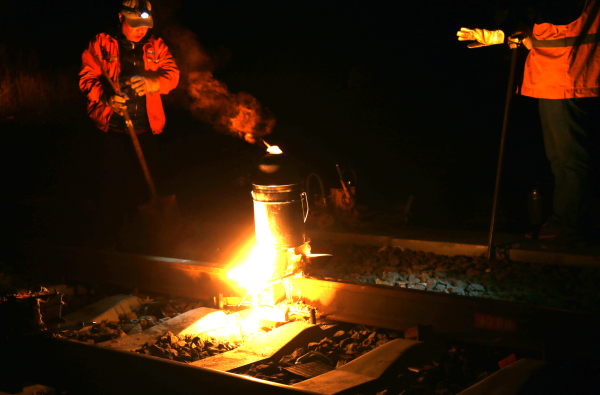 在预热的过程中,职工们开始准备焊剂,等待钢轨预热结束后,迅速点燃焊剂向砂模内浇筑,焊剂高温反应温度达到3000℃左右,脸上的汗珠滴落到钢轨上瞬间蒸发,但大家毫不在意。夜色中,“烟花”映衬着施工现场的每一个忙碌的身影,在寂静的山谷中显得格外醒目。