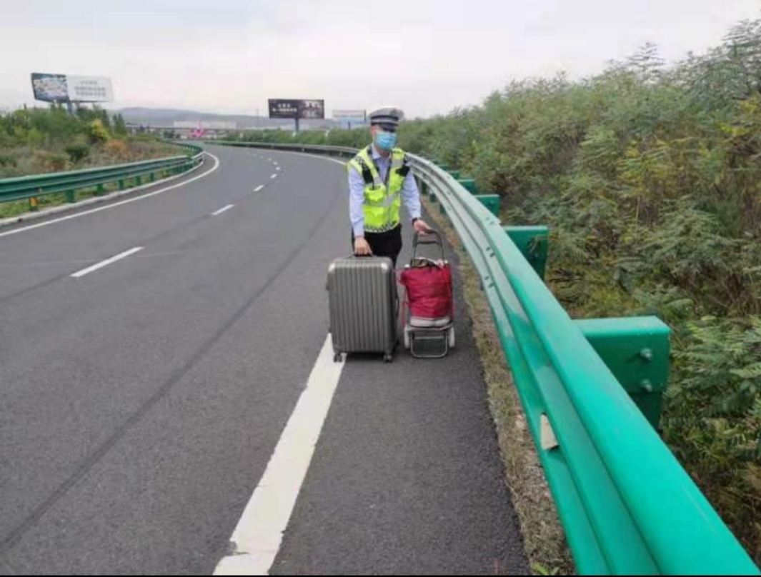 民警得知事情的来龙去脉后,首先要求客车驾驶员详细检查车内物品,确认丢失物品的数量,同时安抚失主情绪,与其详细确定丢失行李的特征。得到明确指示后,民警立即驾驶警车前往丢失地点查找,因处于弯道处无法停车,所以民警只能徒步寻找行李箱。经过10几分钟的寻找,民警在行车道和绿化带内找到丢失行李,随后立即将行李箱送至警车内,带回延吉西收费站,消除了道路交通隐患。