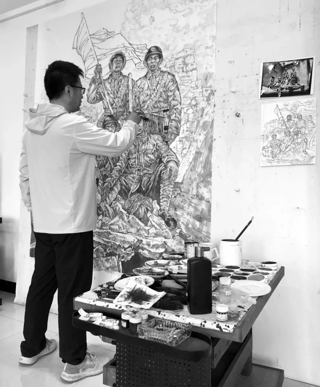 吉林省书画院画家崔宇绘画的《峥嵘岁月》,用水墨材料写实的手法表现主题,用电影分镜头的形式去组织国画的画面,希望通过画面回溯那段峥嵘岁月,表现战争中军民一心的英勇气概和不屈不挠的斗争精神。