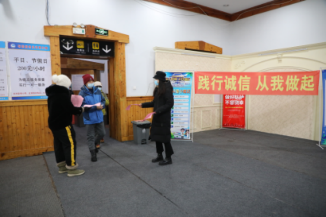 11月27日净月潭景区在滑雪场开业之际,开展了质量诚信宣传倡议活动,在活动现场工作人员通过发放倡议书,解答游客问题等形式,向广大游客宣传介绍了景区诚信经营的服务承诺,游客文明游览的常识,以及游客的投诉电话等。