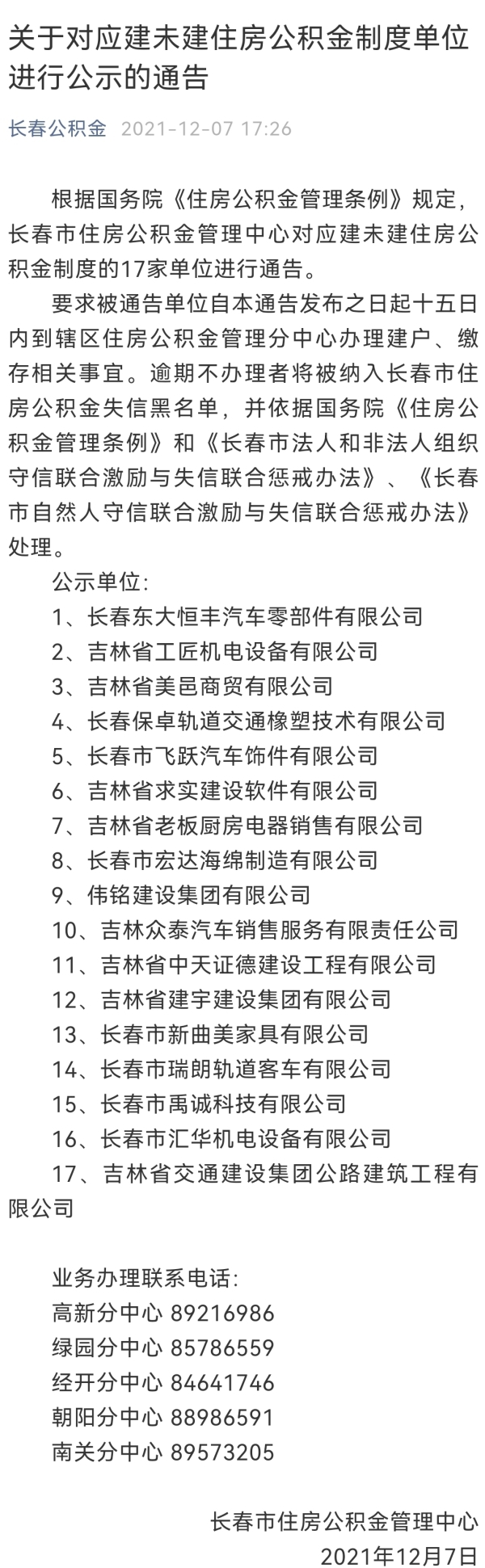 中国吉林网获悉,近日,长春市住房公积金管理中心对应建未建住房公积金制度的17家单位进行通告。