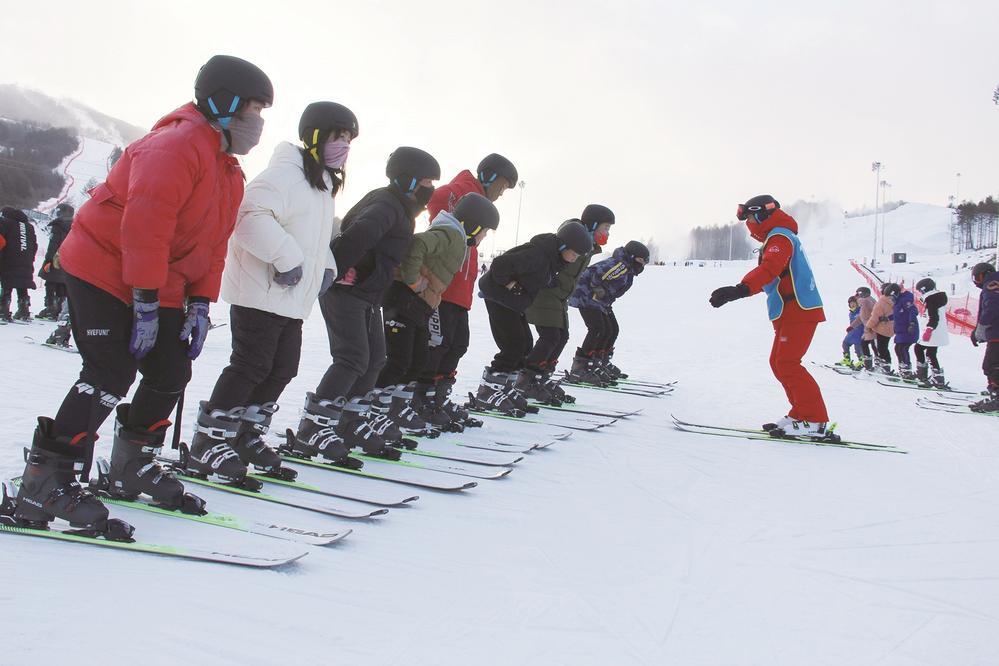 在万峰通化滑雪度假区,专业教练正在对学生进行示范教学。 本报记者 隋二龙 摄