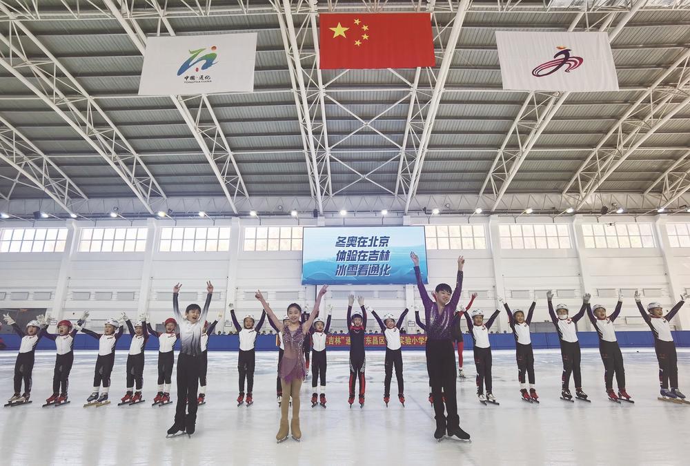 孩子们在新建的滑冰馆里体验冰上运动。 本报记者 隋二龙 摄