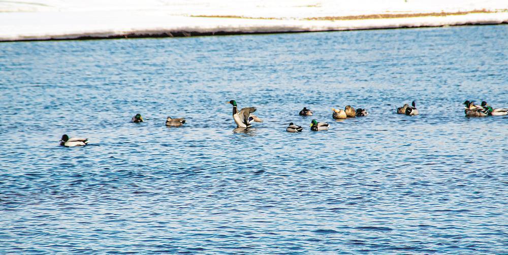 近日,随着气温逐渐回升,长春市伊通河水面出现了成群的绿头鸭,它们畅游觅食、追逐嬉戏,成为一道和谐的生态图景。