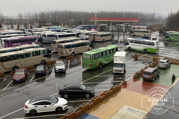 3月29日下午,在吉林南服务区,来自白山和通化的121辆转运车辆完成阶段性任务,在经过严格消杀后,冒雨离开吉林市。转运司机回到所在城市后,将按照要求进行隔离。