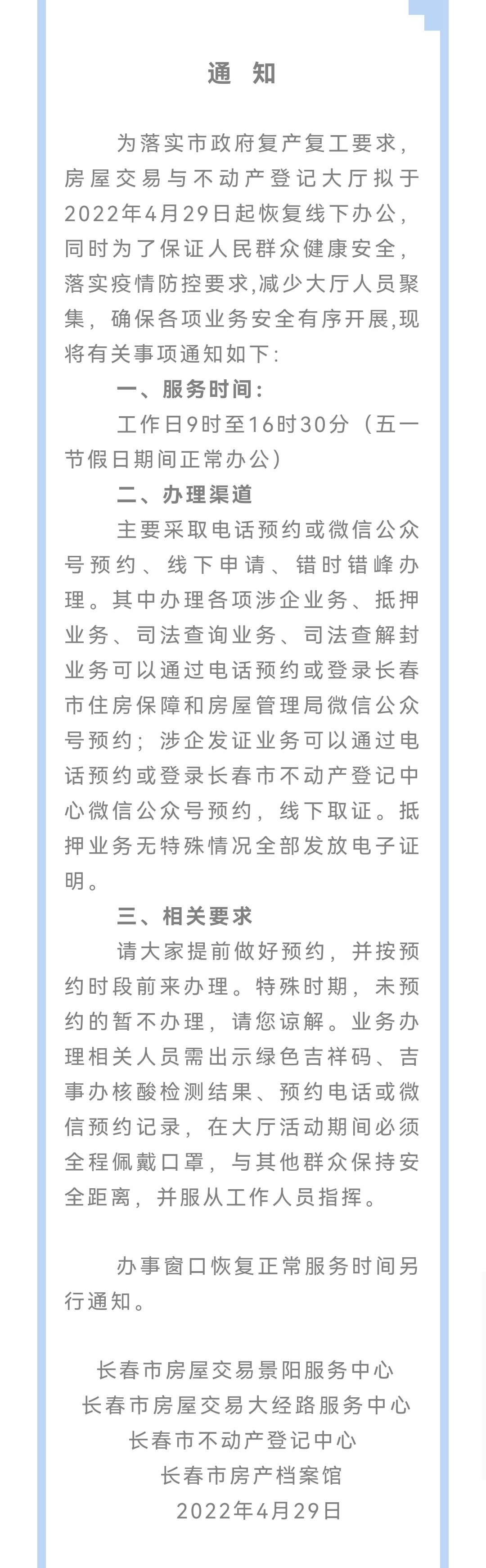 中国吉林网获悉,长春市不动产登记中心从4月29日起恢复线下办公。