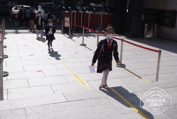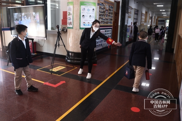 中国吉林网记者在校门口看到,学校领导、校医、护学岗教师已分工明确,分别就位等候,做足准备迎接分批、错时、错峰到校的同学们。相逢在莺歌柳绿的夏季,喜悦、兴奋挂在每一位同学的脸上。同学们佩戴口罩,持健康监测卡,在老师的引导下,按照指定校门、指定楼门、走规定路线,有序通过校门测温、楼门测温进入班级。