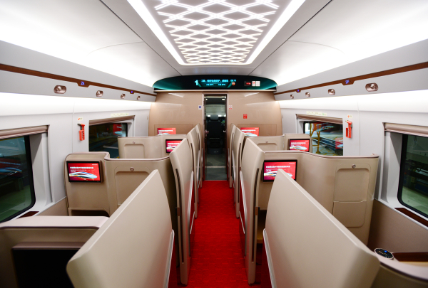 在安全舒适方面,列车配置新型商务座椅,采用“几案屏风”的造型创意,为乘客打造静谧空间。同时列车还采用智能运维系统,通过以太网控车使数据传输速度提高60倍以上,应用车载安全监测系统及故障预测和健康管理系统,构建“车地一体”的大数据分析平台;列车监控室实现多屏合一,并为机械师配备智能终端系统,提升日常巡检和应急处置效率,为列车安全保驾护航。