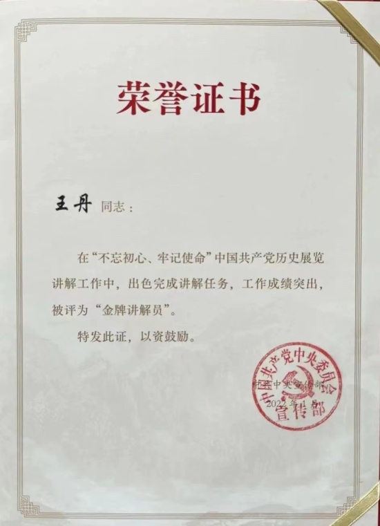 不断钻研思考的精神助力王丹出色地完成了此次讲解任务。王丹说:“对我来说这段经历弥足珍贵,作为年轻党员,获得中共中央宣传部的表彰,更是莫大的鼓励。在为期一年的讲解工作中,我不仅学习到了百年党史知识,还收获到了很多珍贵的友情。”