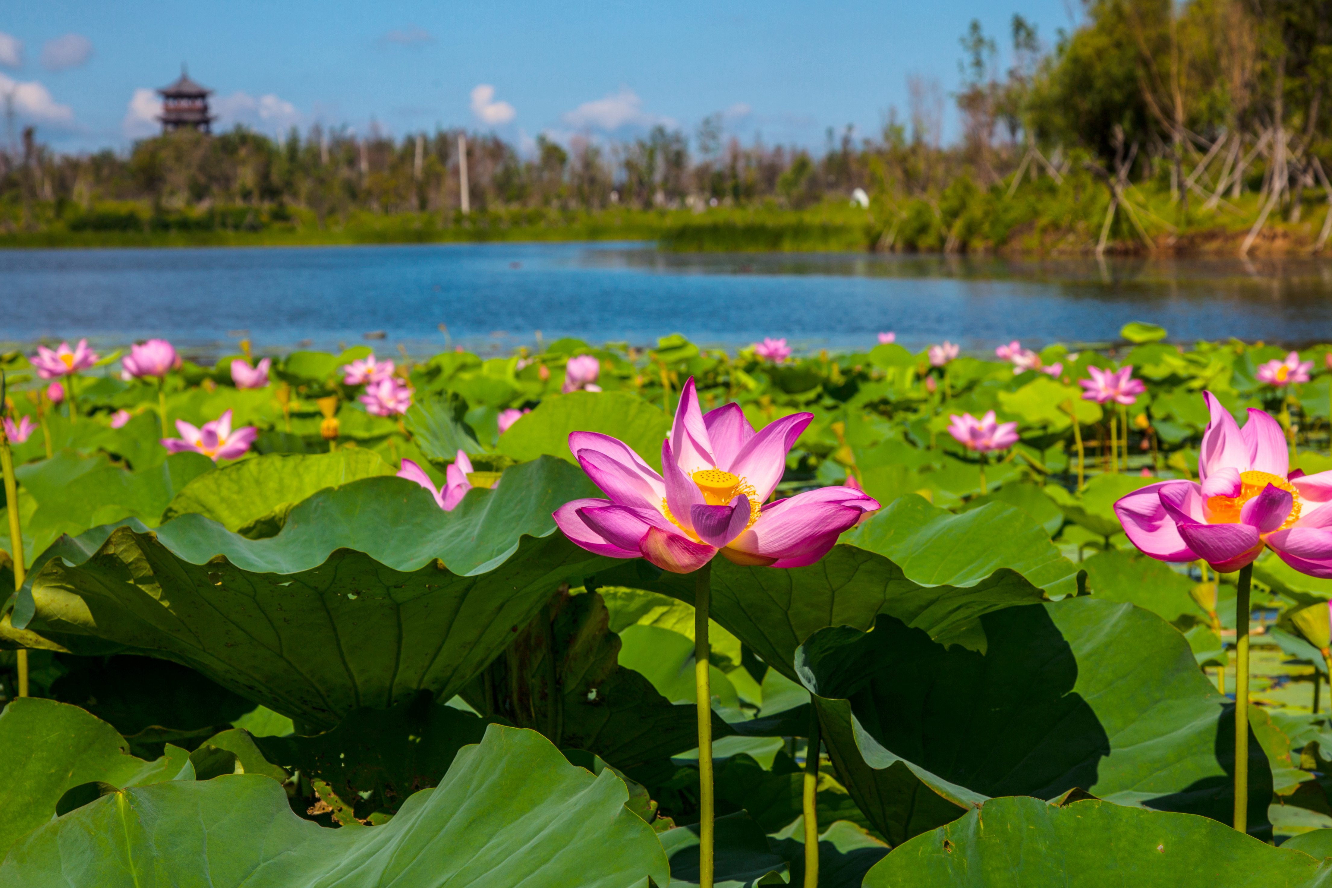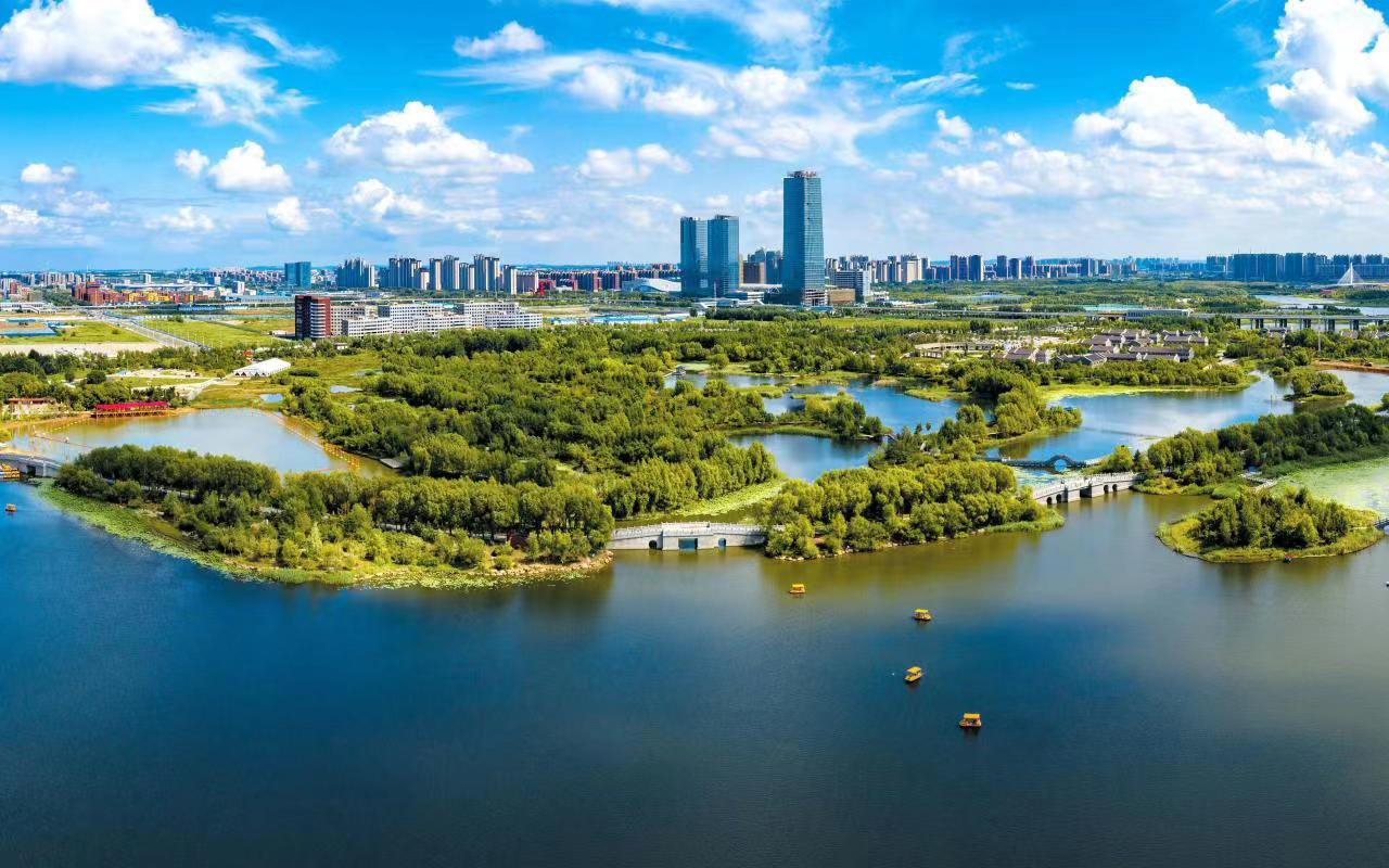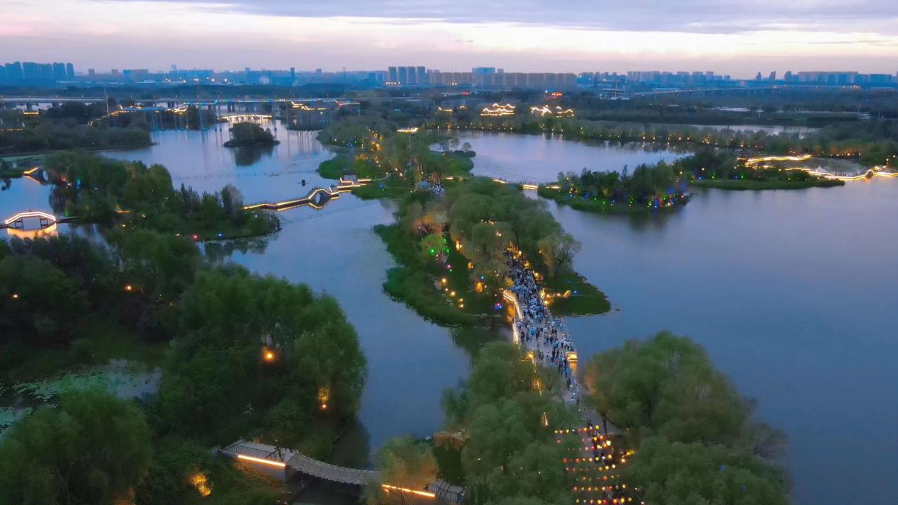 现在,寻着湿地公园的游河航线,既可白昼泛舟,亦可夜晚赏景,约上三五好友,乘一条小木船,游河入湖,观楼,赏荷,玩水……湖溪交错,清风习习,碧波荡漾,杨柳护堤,此情此景,让人仿佛置身于世外桃源、人间仙境。都市人心驰神往的原生态生活乐园如今就在身边。“人,诗意地栖居”已不再是美丽的词句和哲学理念,北湖湿地正演绎着北国最为温情浪漫的诗意生活。