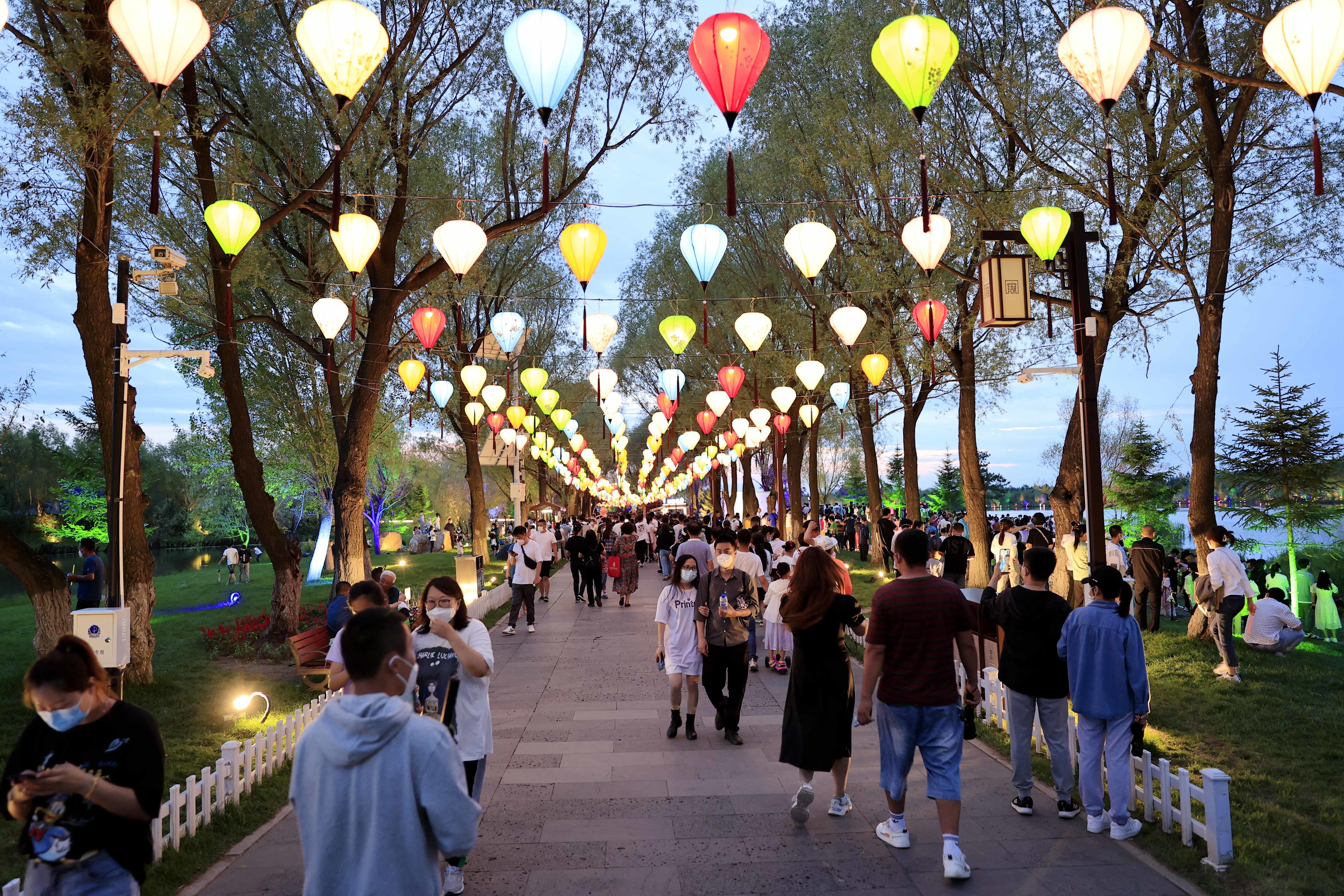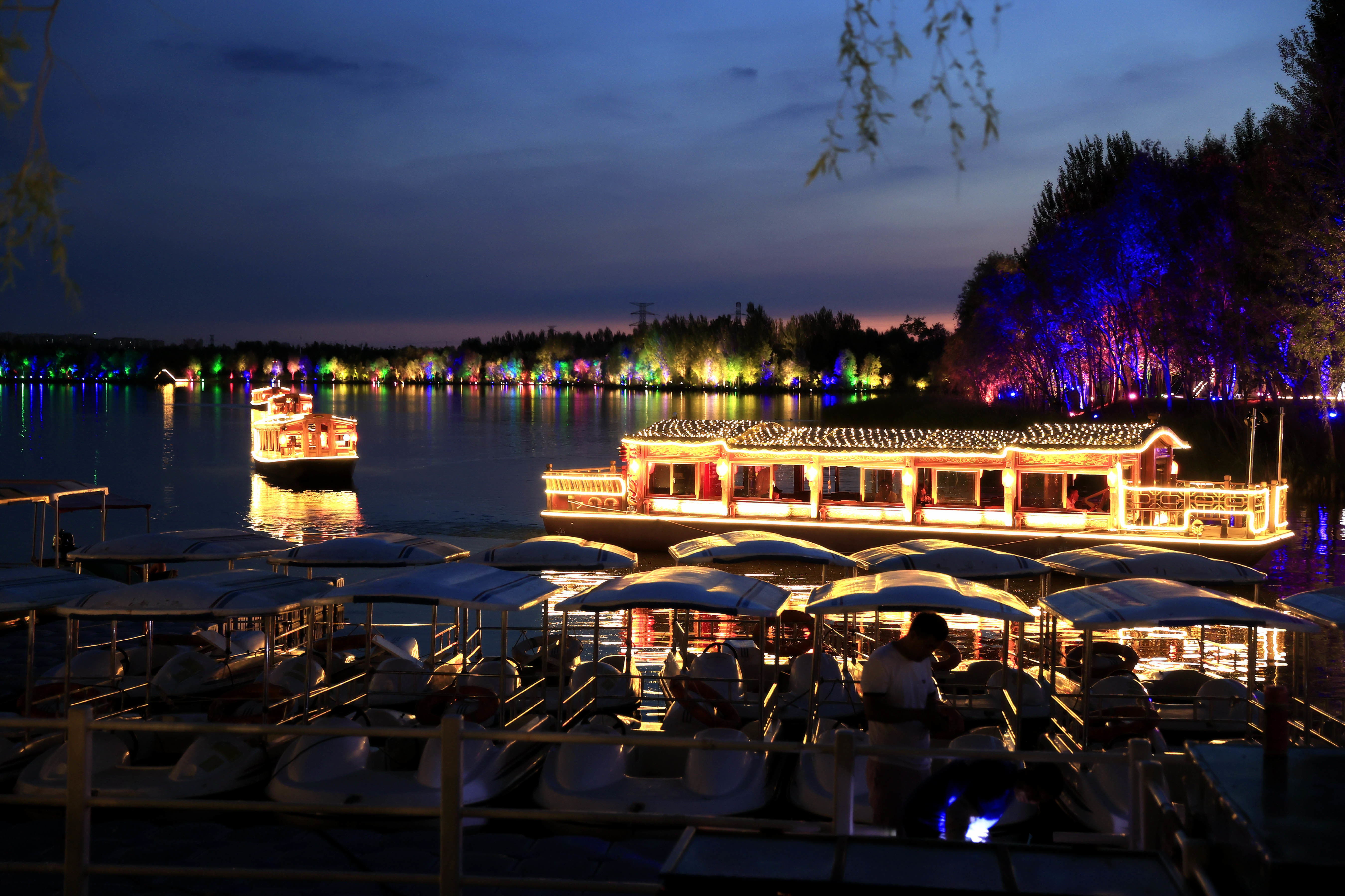 这是一场穿越古今的沉浸体验,也是一次逃离喧嚣的心灵之旅。古时文人雅士以夜晚泛舟为乐,随波畅游间抒发情怀,留下诸多佳词丽句。夜间的北湖画舫更具古韵风情,宋韵仿古风格的画舫迤逦前行在湖面之上,安静地徜徉于柳堤、十三孔桥、景观塔等北湖盛景之间。船行景移之间,带你穿越回宋朝,成为书画中的文人雅士。从画舫遥看岸上的人间烟火,水面仿佛隔绝了一切烦恼,卸下肩上重担,就在这夜色之中让身心沉静。据悉,此次特色夜游船游程环湖一周,全程15分钟左右,营业时间为17:00~21:00。除此之外,园区在不同的湖心岛上还分别设有帐篷营地、美食集市等项目,不论你是乘坐画舫游览北湖美景,还是搭建帐篷户外露营,再或是漫步集市大快朵颐,都能让你流连忘返。