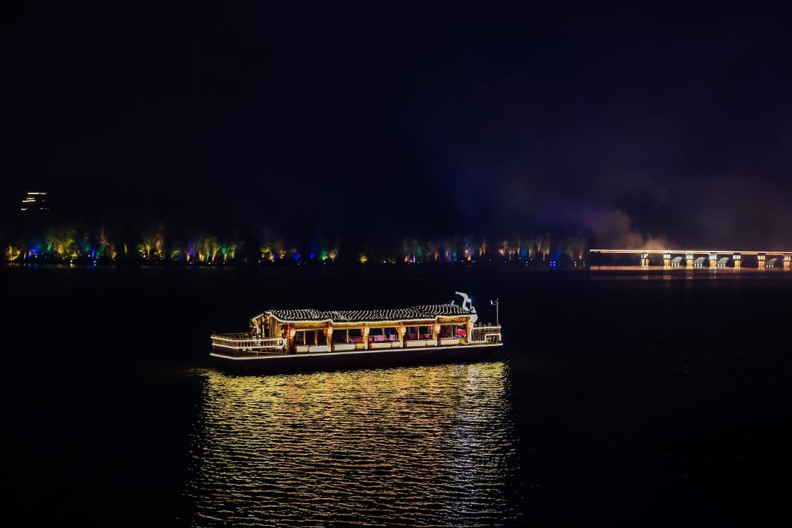 夜幕下的北湖湿地公园,与白日有着很大的不同,光影勾勒出的岸线倒映在水面之上,交相呼应的璀璨美景,美得如梦如幻。从水上邻里码头登上画舫,泛舟湖上,一边欣赏着良辰美景,一边定格下美好的场景和瞬间。