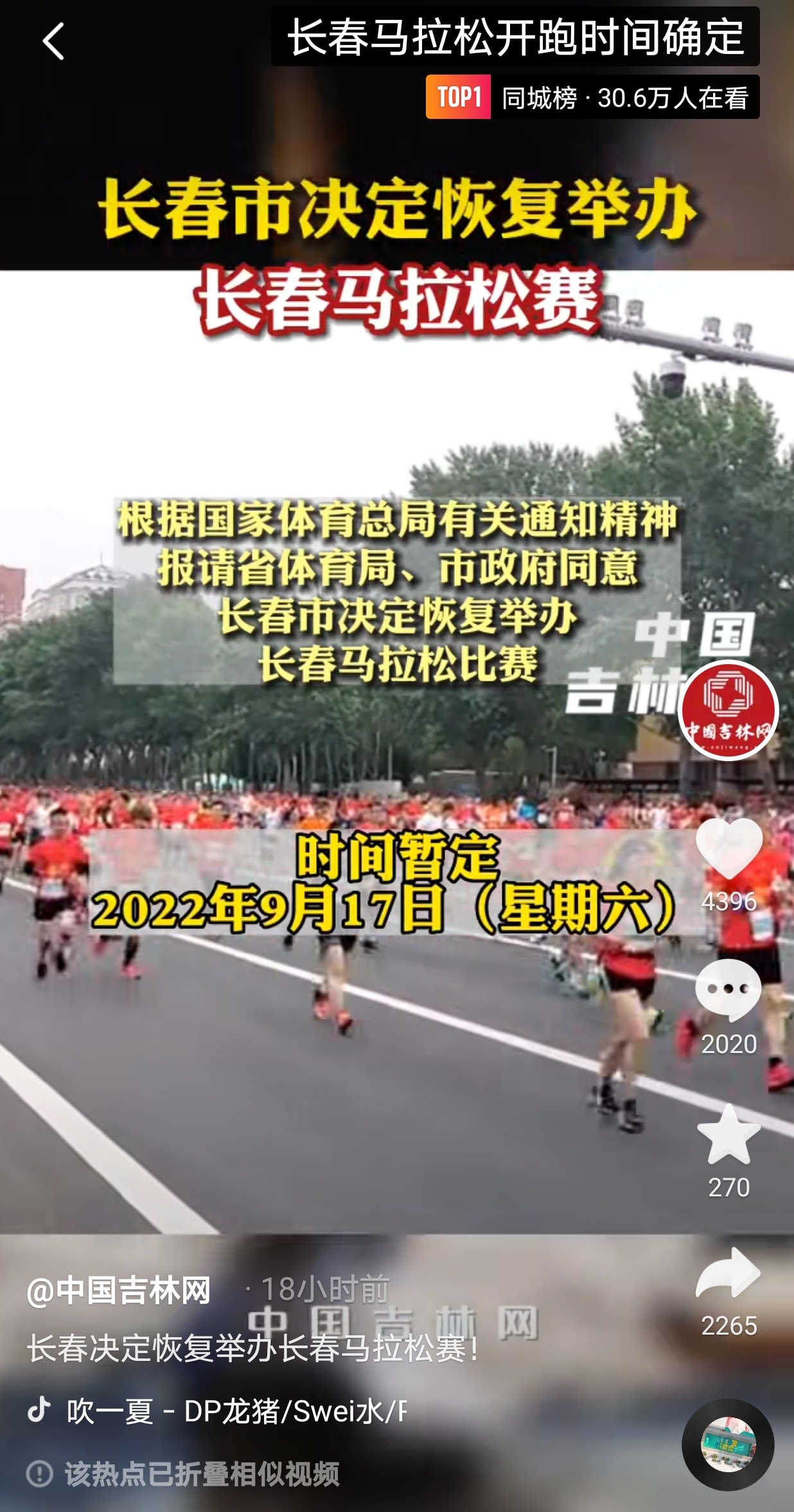 8月15日晚,中国吉林网从长春市体育局获悉,2022长春国际马拉松赛将恢复比赛,比赛时间初定于9月17日。消息一出,热度从昨晚延续到今天。市民、马拉松爱好者纷纷为长马点赞、留言。