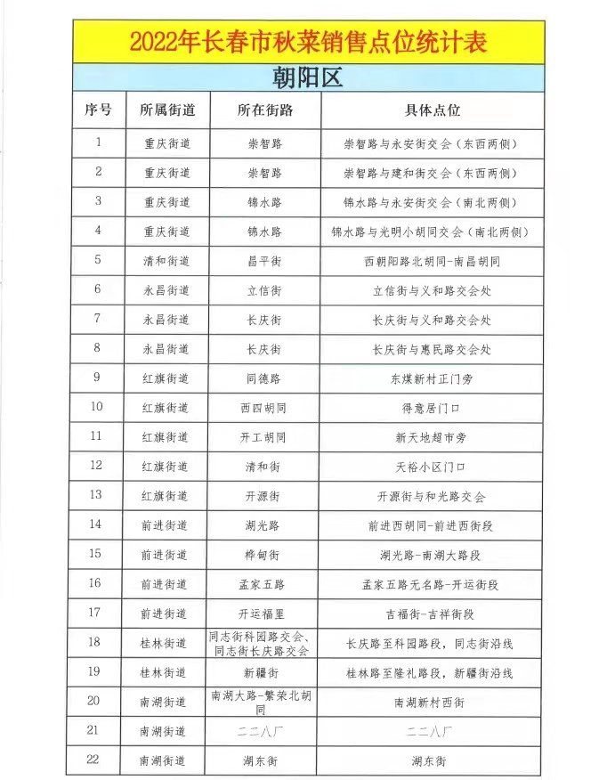 根据长春市城市管理局关于加强2022年秋菜上市期间城市管理工作的通知,秋菜销售点位尽量设置在次要街路、背街小巷、居民小区、早市场,采取分散设置多点位、少摊位的办法,在满足市民需求前提下,尽可能减少对交通的影响。