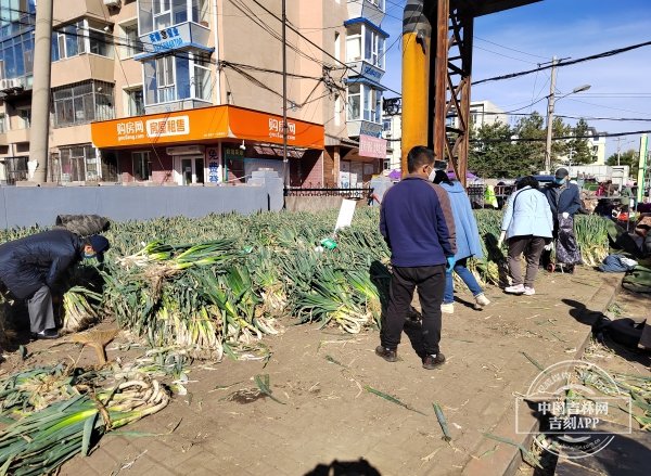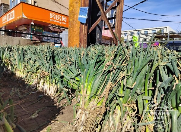 在宋大姐的白菜厢货车不远处,摆放整齐的成捆大葱仿佛“绿色海洋”。