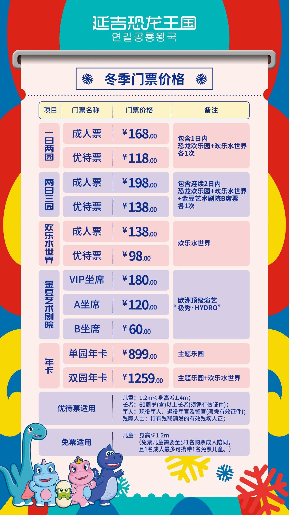 水陆都想玩,一天不过瘾。这个冬天,延吉恐龙王国让你尽情玩个够!两日嗨三园,欢乐加时加量不加价!高能刺激的心跳狂飙、萌力十足的撸宠乐园、乘风破浪的玩水体验、欧洲团队的惊艳炸场,没错,仅需198元,就能让你获得全方位的快乐体验。恐龙欢乐园+欢乐水世界+金豆艺术剧院,198元两日玩三园,超值又过瘾!