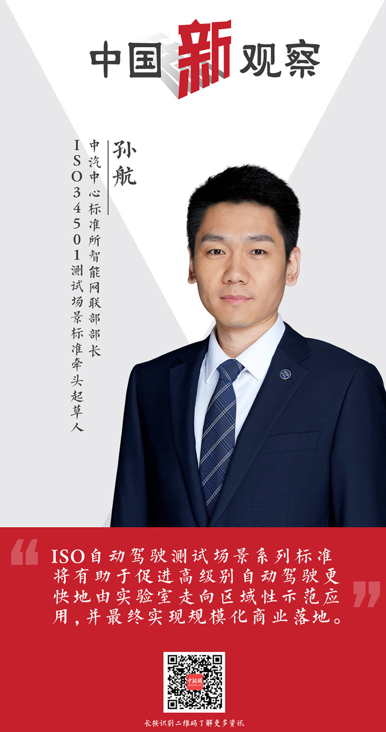 对此,中新网“中国新观察”栏目采访了国际标准化组织道路车辆委员会自动驾驶测试场景工作组(ISO/TC22/SC33/WG9)召集人、中国汽车技术研究中心有限公司标准化研究所所长王兆,ISO34501测试场景标准牵头起草人、中国汽车技术研究中心有限公司标准化研究所智能网联部部长孙航。