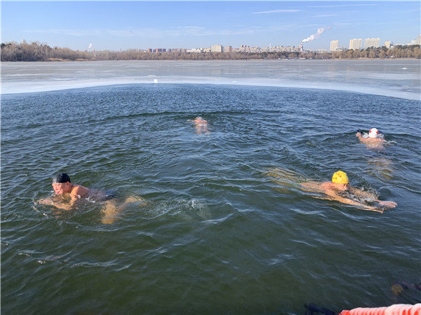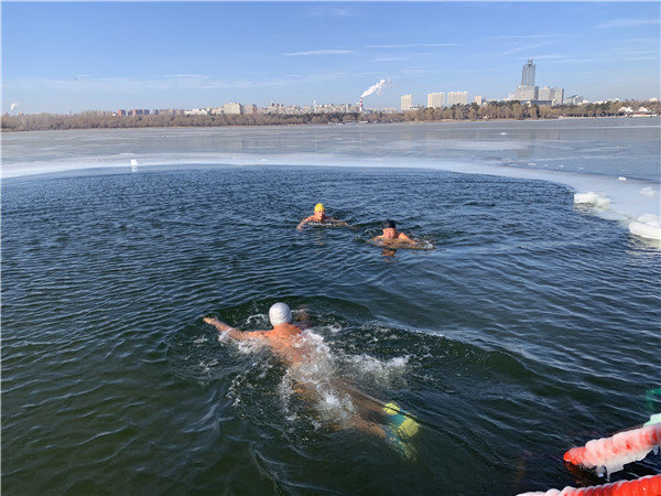 气温零下11摄氏度,水温近零摄氏度。这种情况下,刘孟南和他的伙伴们一般下水游两三分钟后就会出水上岸,擦干身体,穿上衣服。“此时全身舒服至极,一整天都感觉精神抖擞。”刘孟南说。