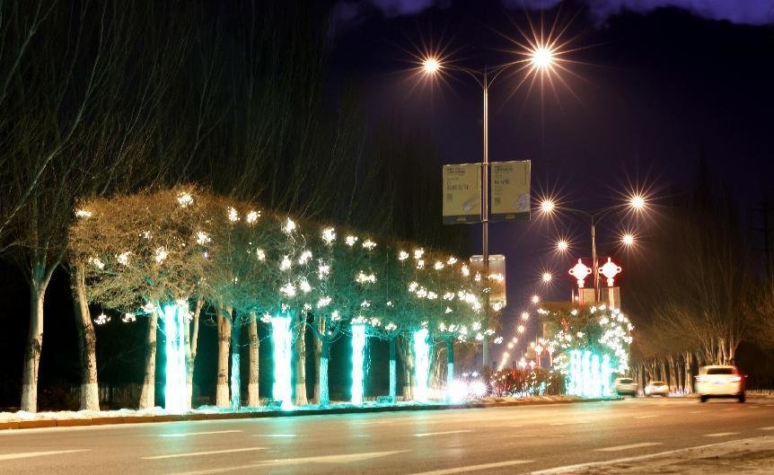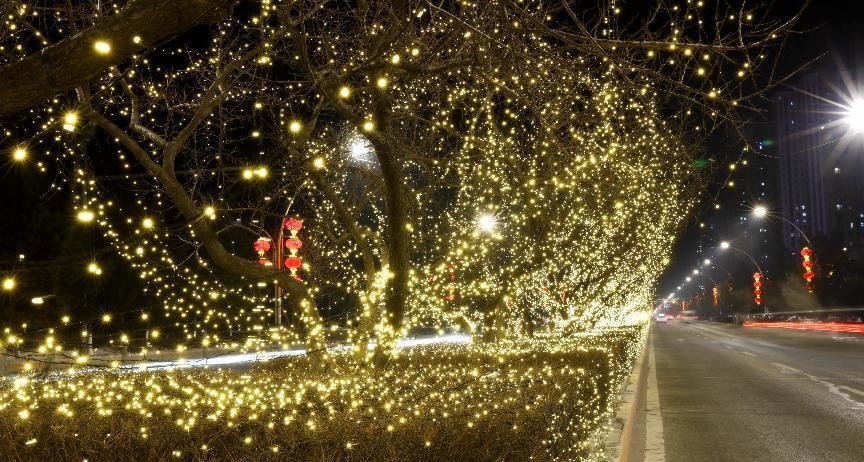 火树银花不夜天,张灯结彩迎新年,长春新区夜景亮化带着浓厚的年味儿。驶入长春高新区硅谷大街,亮彩纷呈、独具匠心的亮化映入眼帘,两侧花柱用全彩外控珠帘灯装饰,中间隔离带拱形景观用幻彩灯带点缀,色彩的交相辉映,扮靓了城市夜景。街路两旁的树干上围绕着丝带状亮化景观小品,树冠上悬挂祥云挂件,彰显了平安吉祥的美好寓意,营造喜庆、祥和的节日氛围,成为了一道靓丽的风景线。
