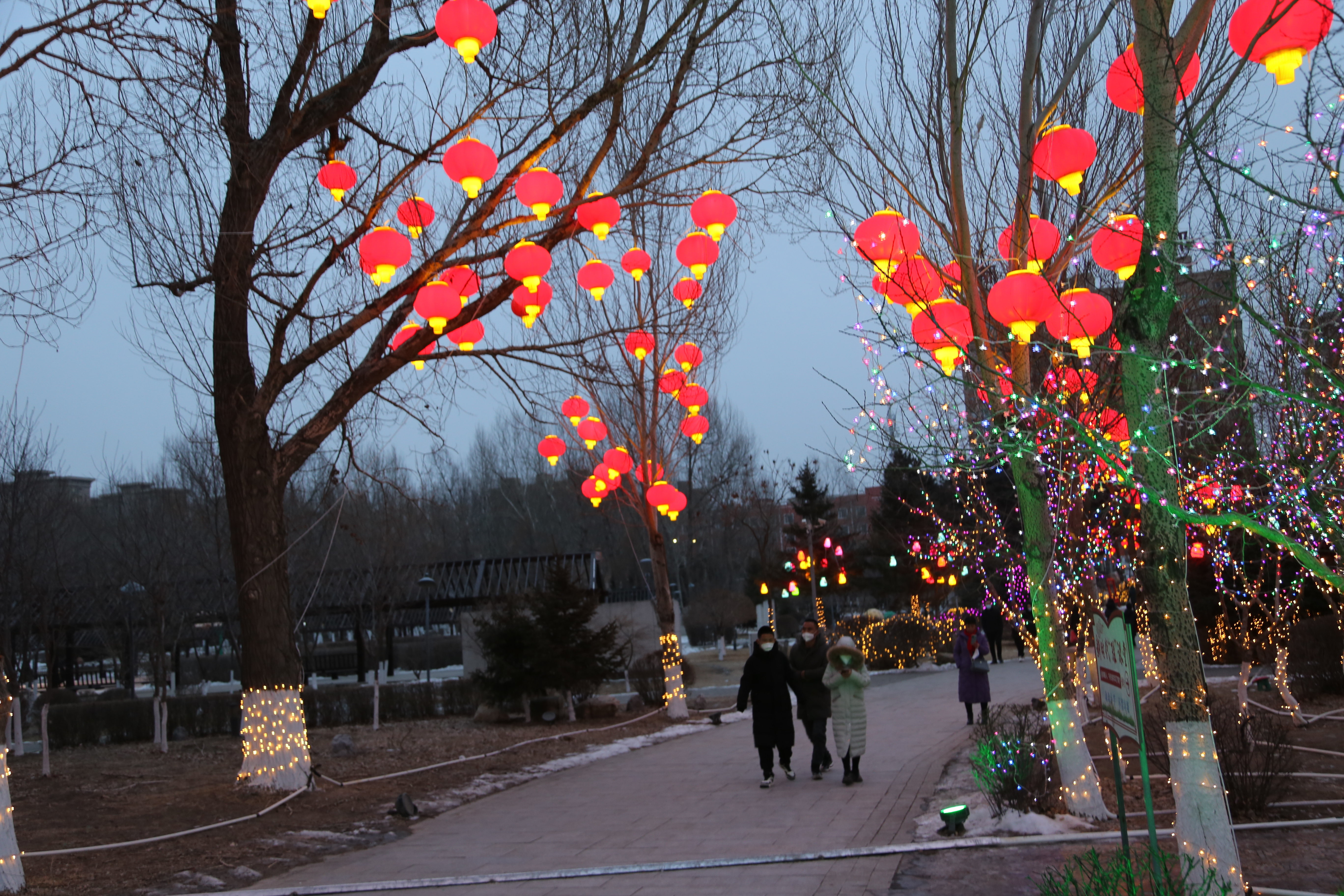 在公主岭市响铃公园,记者看到,北门口的红色灯笼高高挂起,五彩缤纷的气球阵,造型各异的许愿瓶、梅花树、福袋等象征着吉祥之意的亮化美化装饰物使得公园内焕然一新,烘托出了热闹喜庆的新年氛围。